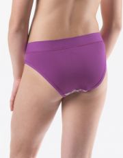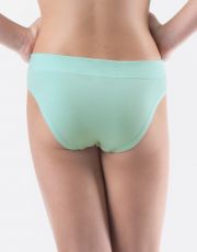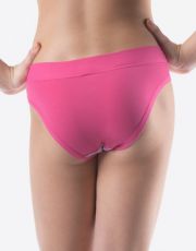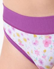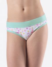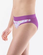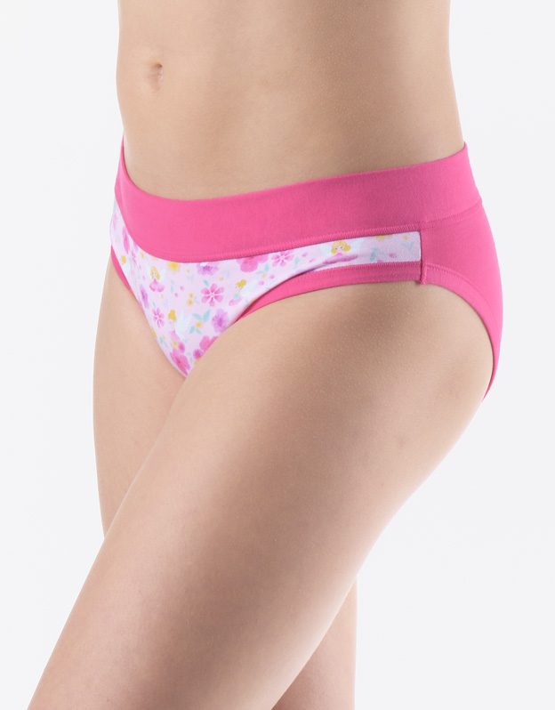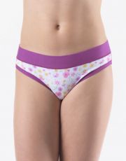 Nohavičky klasického strihu so širším pásovým lemom, dievčenské šité prádlo. Pásový kraj je začistený širším lemom z rovnakého materiálu. Nohavičky sú začistené úzkym lemom z rovnakého materiálu. Predný diel je potlačený. Zadný diel a lemy sú jednofarebné.