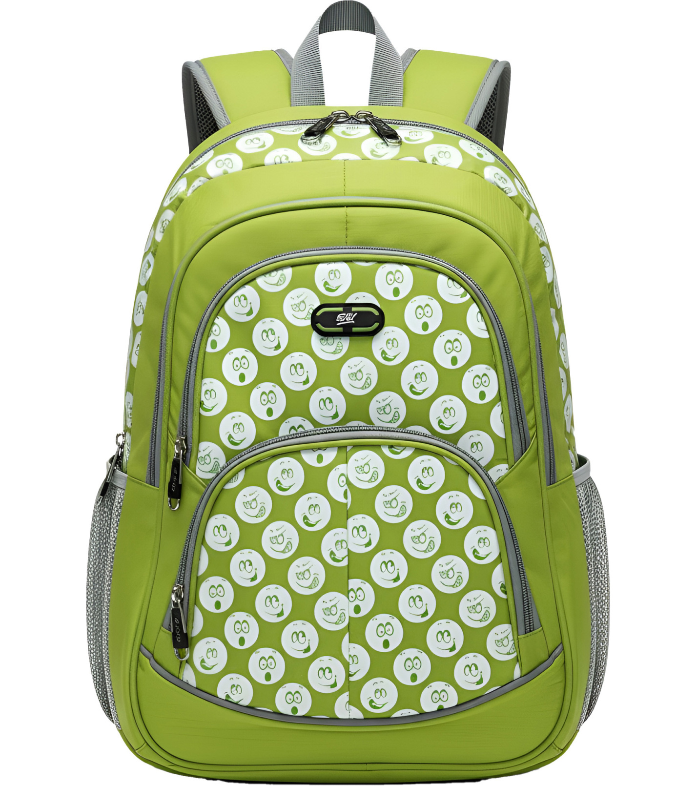 Veselý detský batoh v zelenej farbe s potlačou smajlíkov poteší každé dieťa. Ponúka priestrannú hlavnú komoru, predné vrecko na zips aj bočné sieťované vrecká. Vďaka polstrovaným ramenným popruhom a nastaviteľnému systému nosenia je batoh pohodlný a vhodný do školy, škôlky aj na výlety.