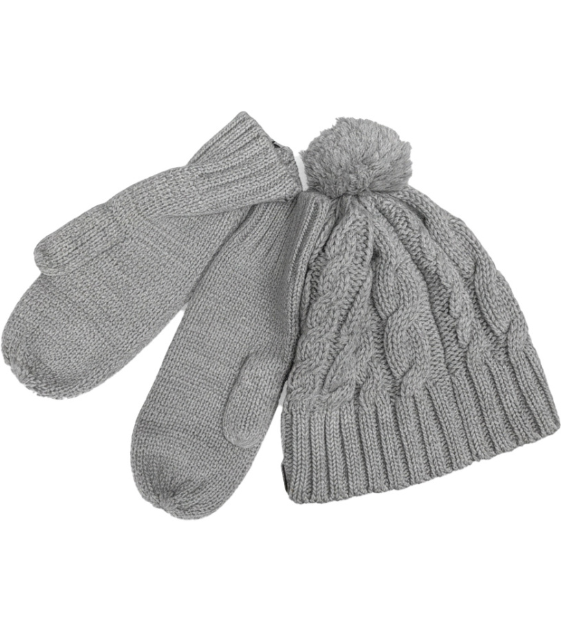 Štýlový zimný set čiapky a rukavíc v neutrálnej šedej farbe. Pletená čiapka s výrazným vrkôčikovým vzorom a mäkkým brmbolcom na vrchu dodáva moderný a hrejivý vzhľad. Jednoduché palčiaky sú príjemné na dotyk a zaisťujú komfort aj v chladnom počasí. Set je ideálny na každodenné nosenie v zime, ľahko sa kombinuje s kabátom aj športovou bundou a poskytuje spoľahlivú ochranu pred chladom.
