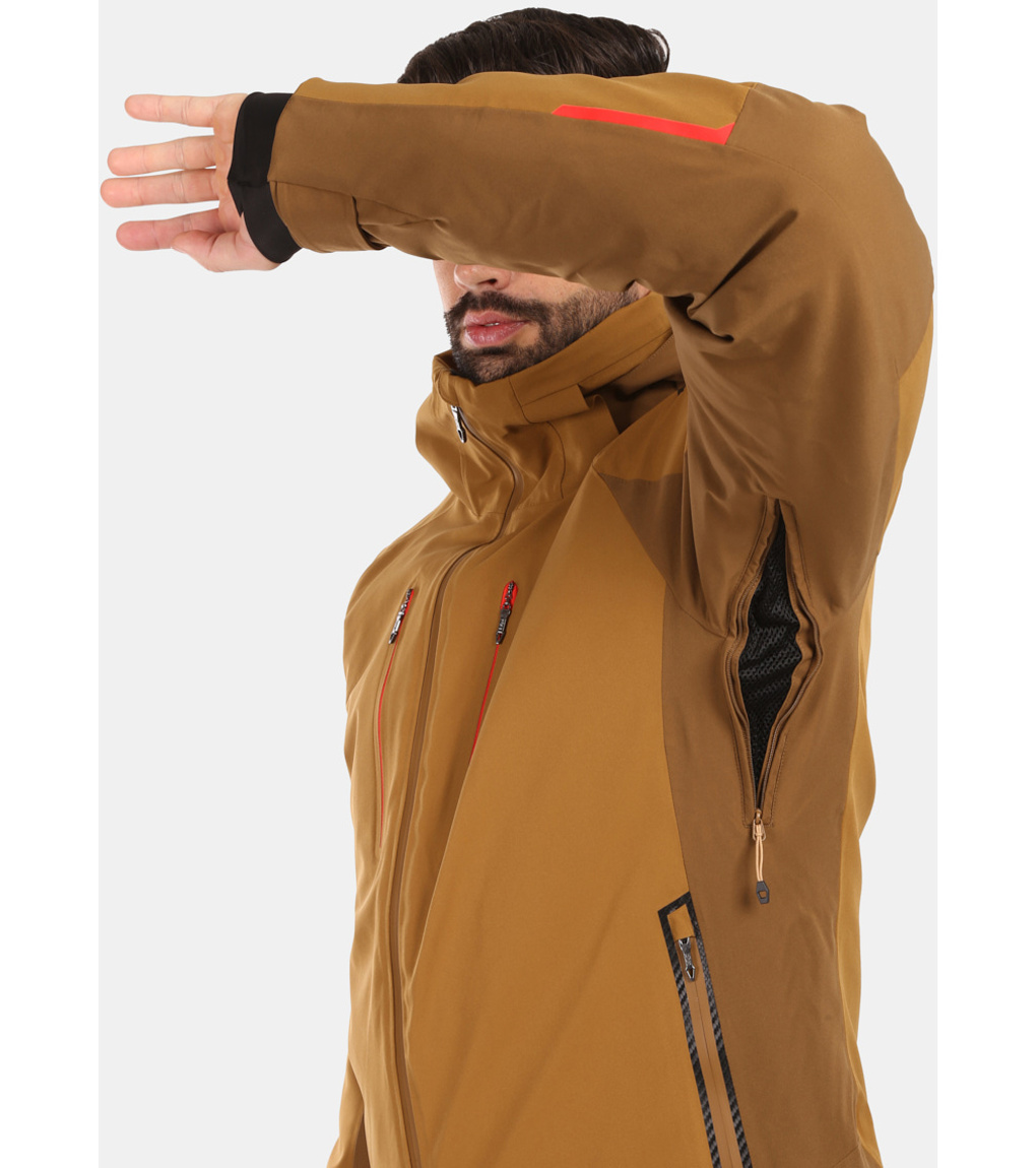 Plne podlepené švy a vodeodolné zipsy zaisťujú dokonalú ochranu proti prenikaniu vlhkosti, zatiaľ čo dlhé ventilačné zipsy v podpazuší umožňujú odvetrávanie pri intenzívnej aktivite alebo teplejšom počasí. Praktické vrecká, vrátane rukávového vrecka na skipass, vnútorné zipsové vrecká a sieťové vrecká s handričkou na okuliare, poskytujú dostatok priestoru pre vaše nevyhnutnosti. Odnímateľná kapucňa so spevneným šiltom, protisnehový golier, rukávové manžety a sťahovanie spodného lemu suchým zipsom zaisťujú maximálny komfort a ochranu. Bezpečnosť zvyšuje integrovaný prvok RECCO, ktorý zlepšuje šance na nájdenie v prípade nehody v teréne.
