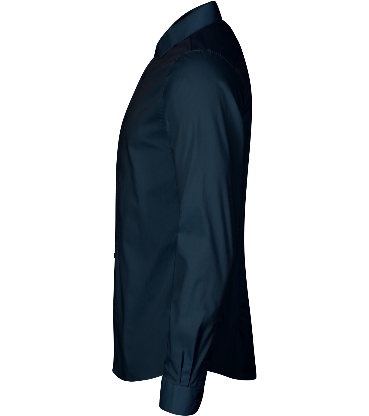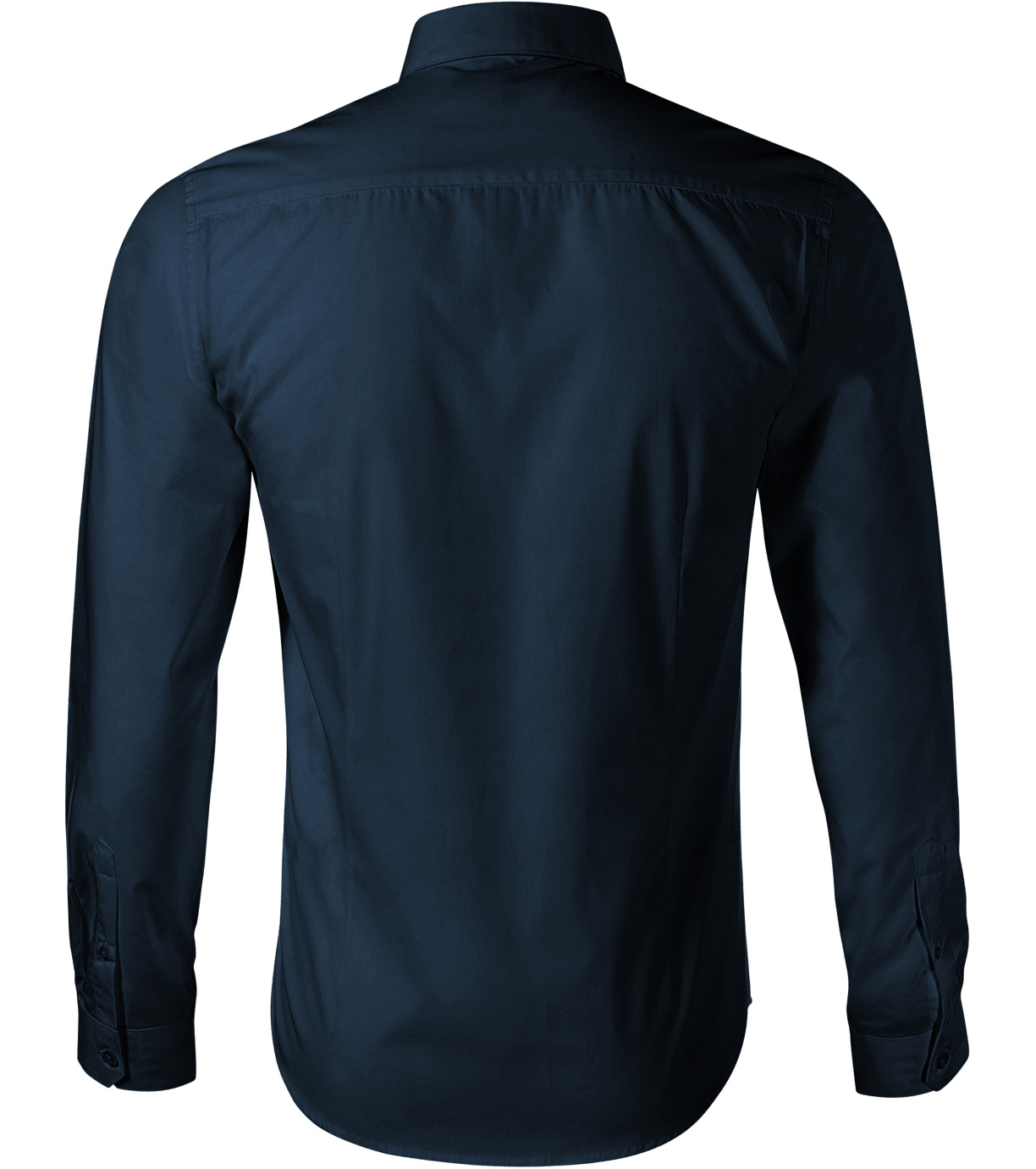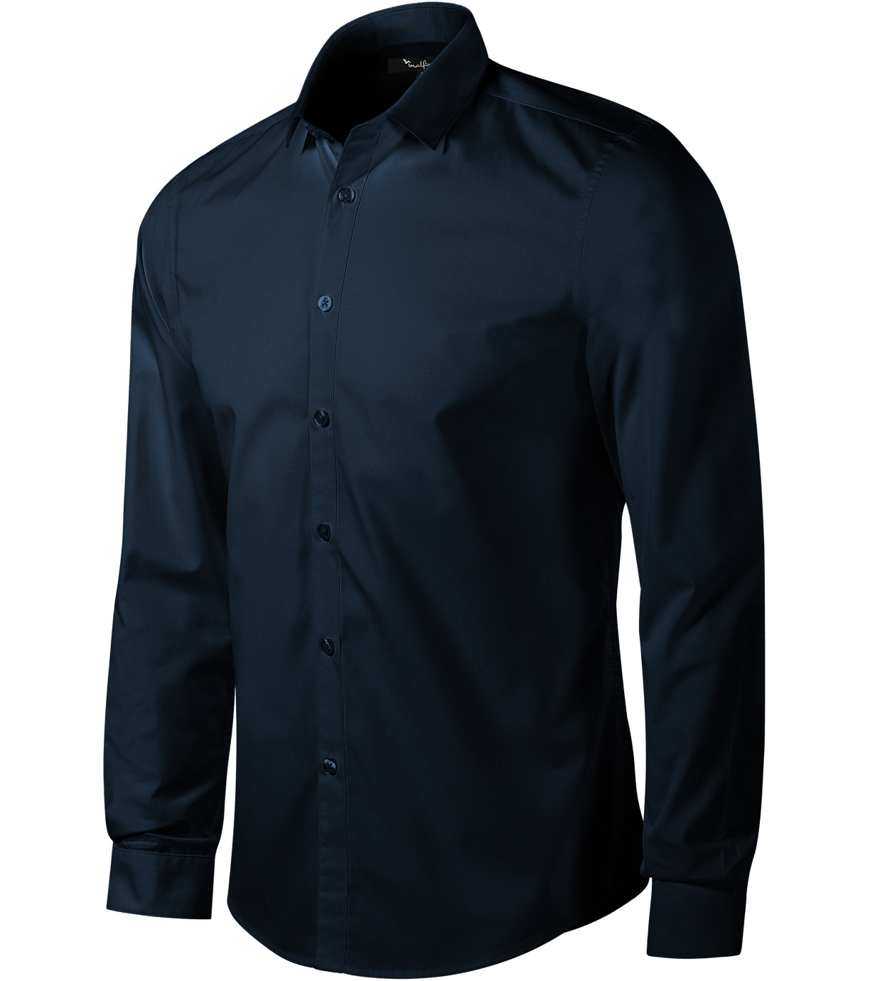 Panská košeľa s dlhými rukávmi a šikmou manžetou na 1 gombík v úzkom strihu s bočnými švami vhodnými na výšivku a potlač má dvojitý sed a klin na chrbte, dvojdielny košeľový golier, zosilnené konce goliera, predné okraje ukončené légou, perleťové gombíky vo farbe materiálu (2 náhradné gombíky navyše) a tvarovaný spodný okraj.
