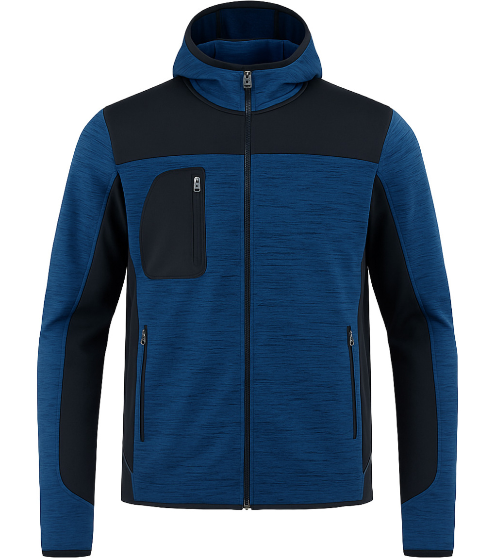 Kombinácia techniky so softshellovými materiálmi a kontrastnými farbami. Dvojfarebné prevedenie s utesneným celoprepínacím SBS zipsom. Má tvarovanú kapucňu s dvojitým prešitím, tenký elastický lem na rukávoch a spodnom okraji. Praktické usporiadanie vreciek pokryje dve vrecká na zips a jedno vrecko na hrudi.