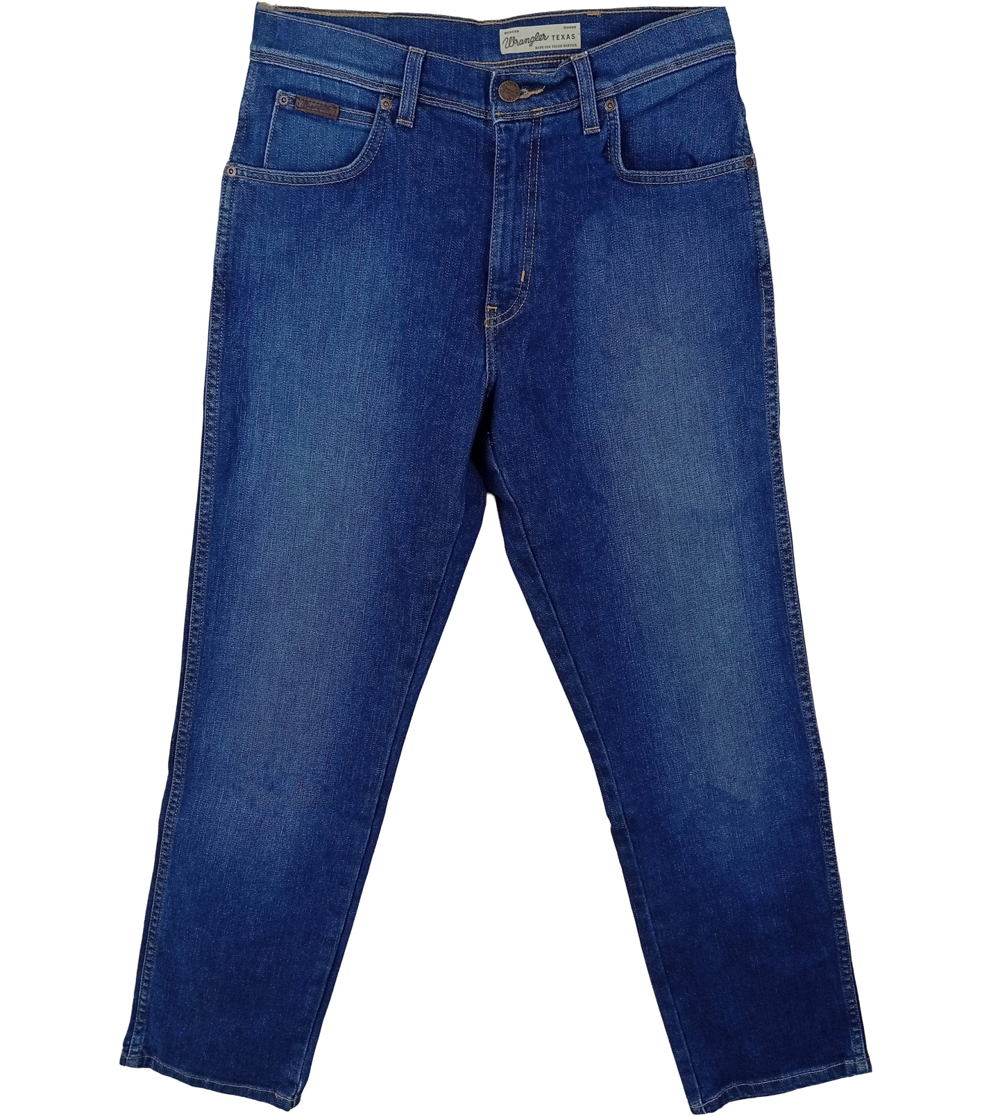 Pánske džínsy Wrangler Texas Stretch v klasickom modrom denime s ľahkým opraným efektom ponúkajú rovný strih (regular fit) so stredne vysokým pásom. Majú päť vreciek, zapínanie na zips s gombíkom a zadné vrecká s ikonickým „W“ prešívaním a koženým štítkom Wrangler.