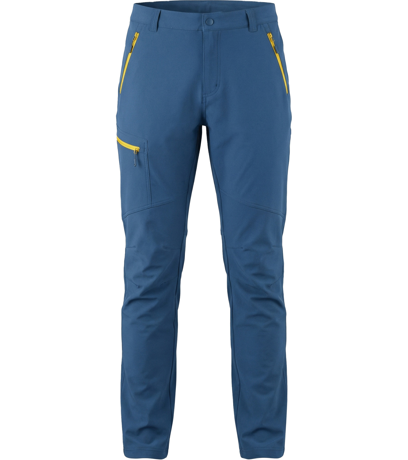Funkčné outdoorové nohavice v modernej modrej farbe, navrhnuté pre aktívny pohyb v prírode aj každodenné nosenie. Odolný a pružný materiál poskytuje vysoký komfort, voľnosť pohybu a zároveň ochranu pri náročnejších podmienkach. Nohavice majú ergonomický strih s tvarovanými kolenami, zapínanie na gombík a pútka na opasok. Praktické zipsové vrecká v kontrastnej žltej farbe umožňujú bezpečné uloženie drobností.