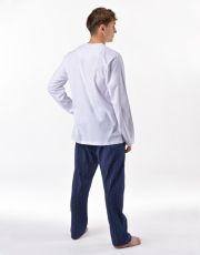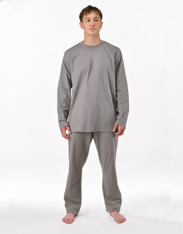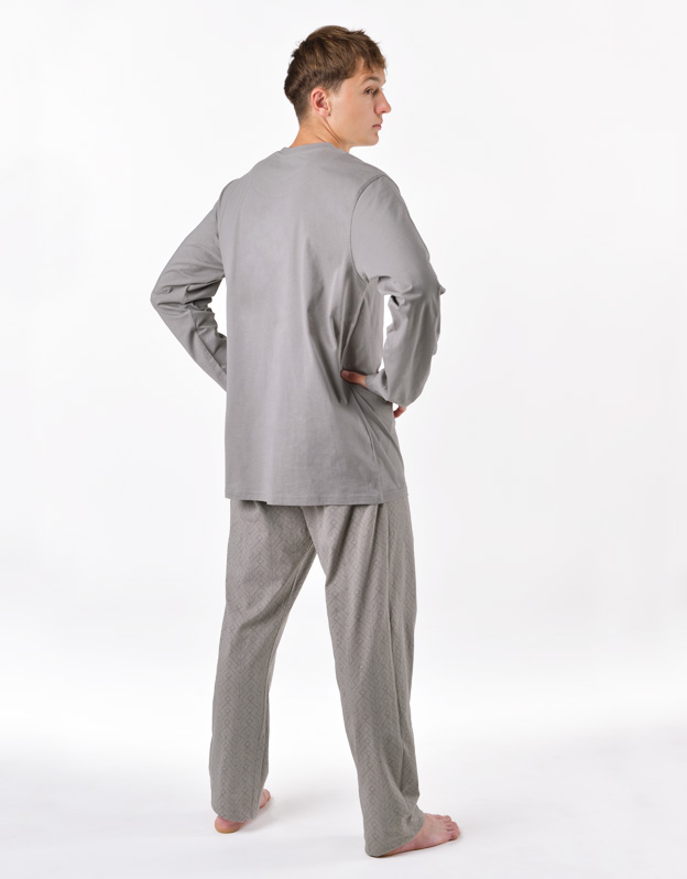 Pánske klasické pyžamo voľného strihu z jemného úpletu Vám poskytne pohodlie počas spánku. Nohavice sú potlačené drobným vzorom, tričko s dlhými rukávmi zdobí menšiu potlač na hrudi.