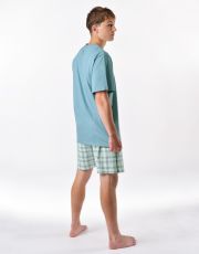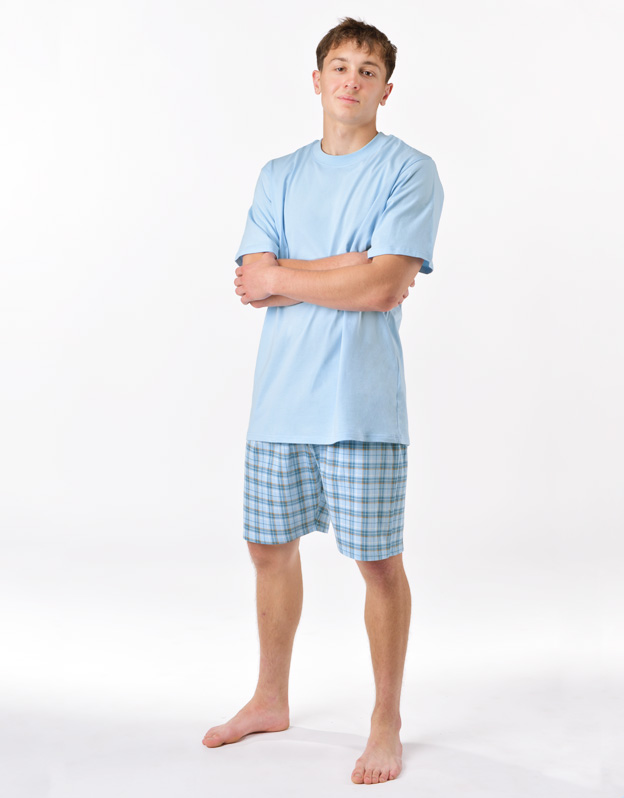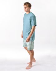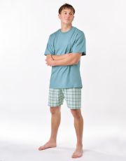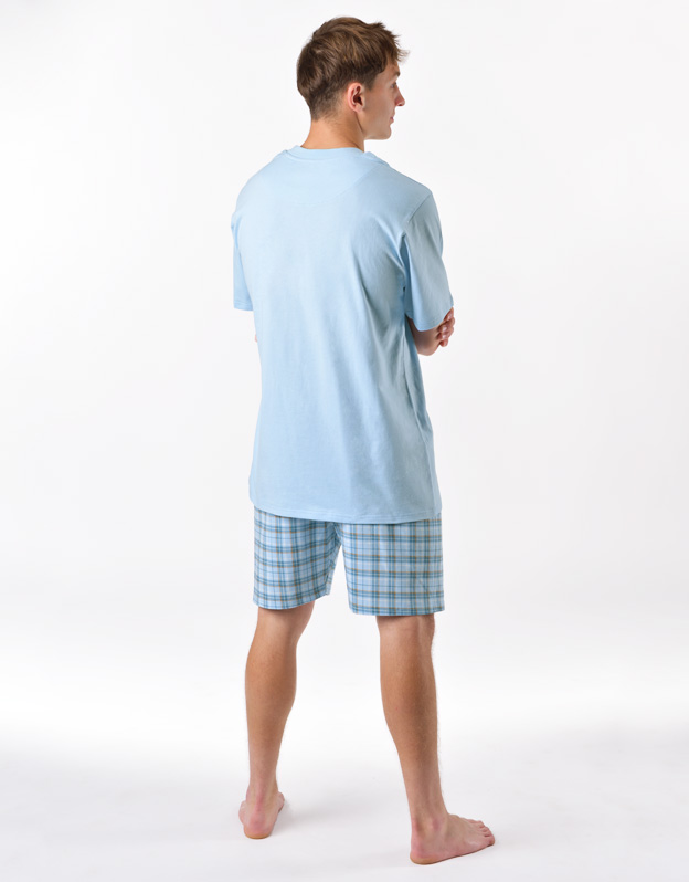 Pánske pyžamo voľného strihu z jemného úpletu Vám poskytne pohodlie počas spánku. Krátke nohavice s obľúbeným vzorom káro dopĺňa tričko s krátkymi rukávmi.