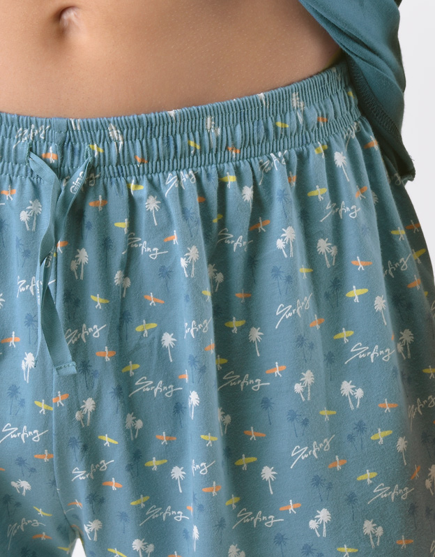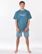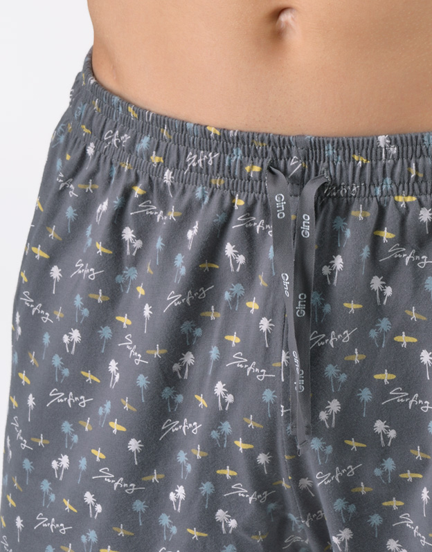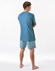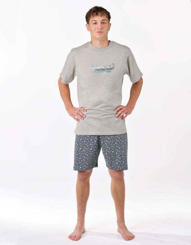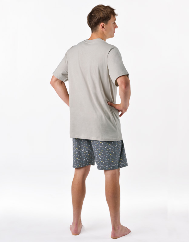 Pánske pyžamo voľného strihu z jemného úpletu Vám poskytne pohodlie počas spánku. Krátke nohavice sú potlačené drobným vzorom, tričko s krátkymi rukávmi zdobí väčšiu potlač na hrudi.