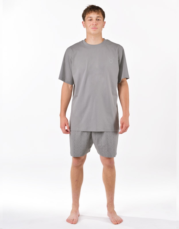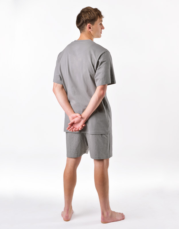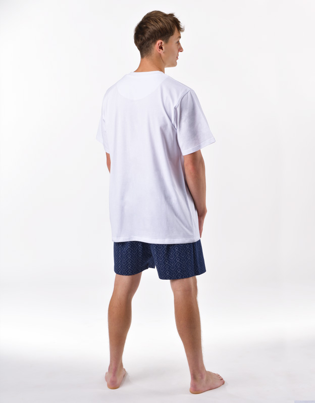 Pánske pyžamo voľného strihu z jemného úpletu Vám poskytne pohodlie počas spánku. Krátke nohavice sú potlačené drobným vzorom, tričko s krátkymi rukávmi zdobí menšiu potlač na hrudi.