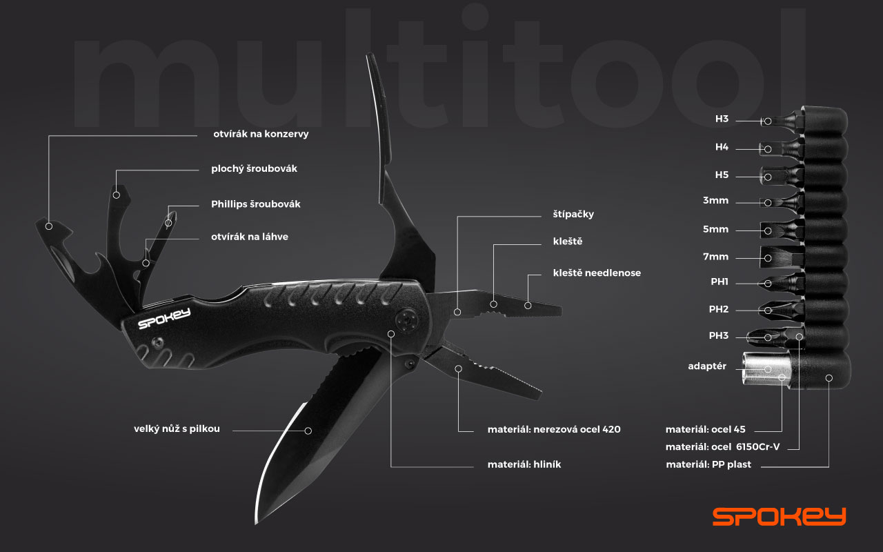 Hledáte kompletní sadu mimořádně užitečných nástrojů, která by nahradila nespočet nářadí, které denně používáte? Víme, jak obtížné je vzít si s sebou veškeré potřebné nářadí, které by mohlo být užitečné během outdoorového výletu nebo během jízdy autem. Multifunkční nářadí Spokey SX-ONE je kompletní sada nářadí v jednom malém kapesním noži, který splňuje všechny požadavky – je to kompaktní a praktický doplněk s velmi širokou škálou využití.