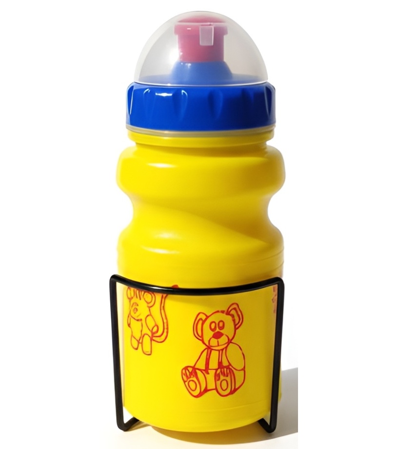 Detská fľaša na bicykel s obrázkami zvierat. Súčasťou je držiak na priskrutkovanie na bicykel.