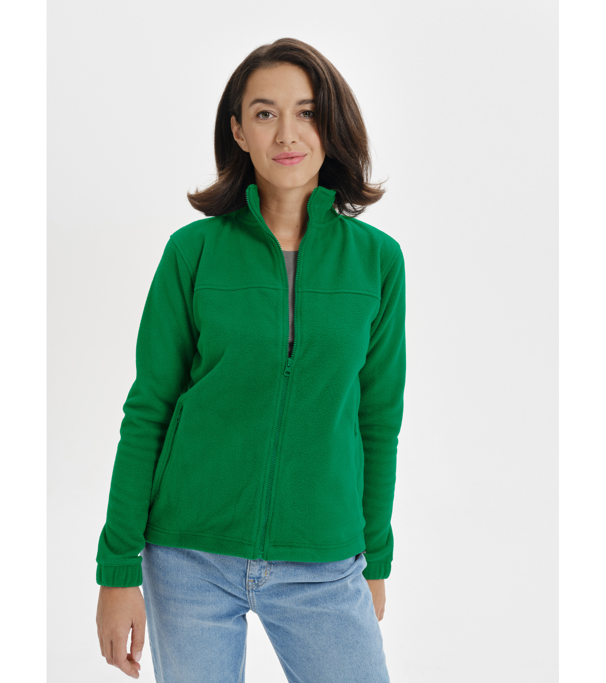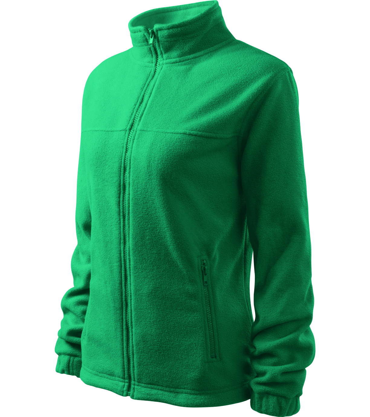 Dámska fleecová bunda v mierne zateplenom strihu z hrejivého materiálu vhodného na vyšívanie a gravírovanie, má vnútorný výstrih zatavený páskou vo farbe vrchného materiálu, kostený zips po celej dĺžke, vrecká s kosteným zipsom, spodný lem s elastickou šnúrkou, lemy rukávov stiahnuté gumou a úpravu proti žmolkovaniu na vonkajšej strane.