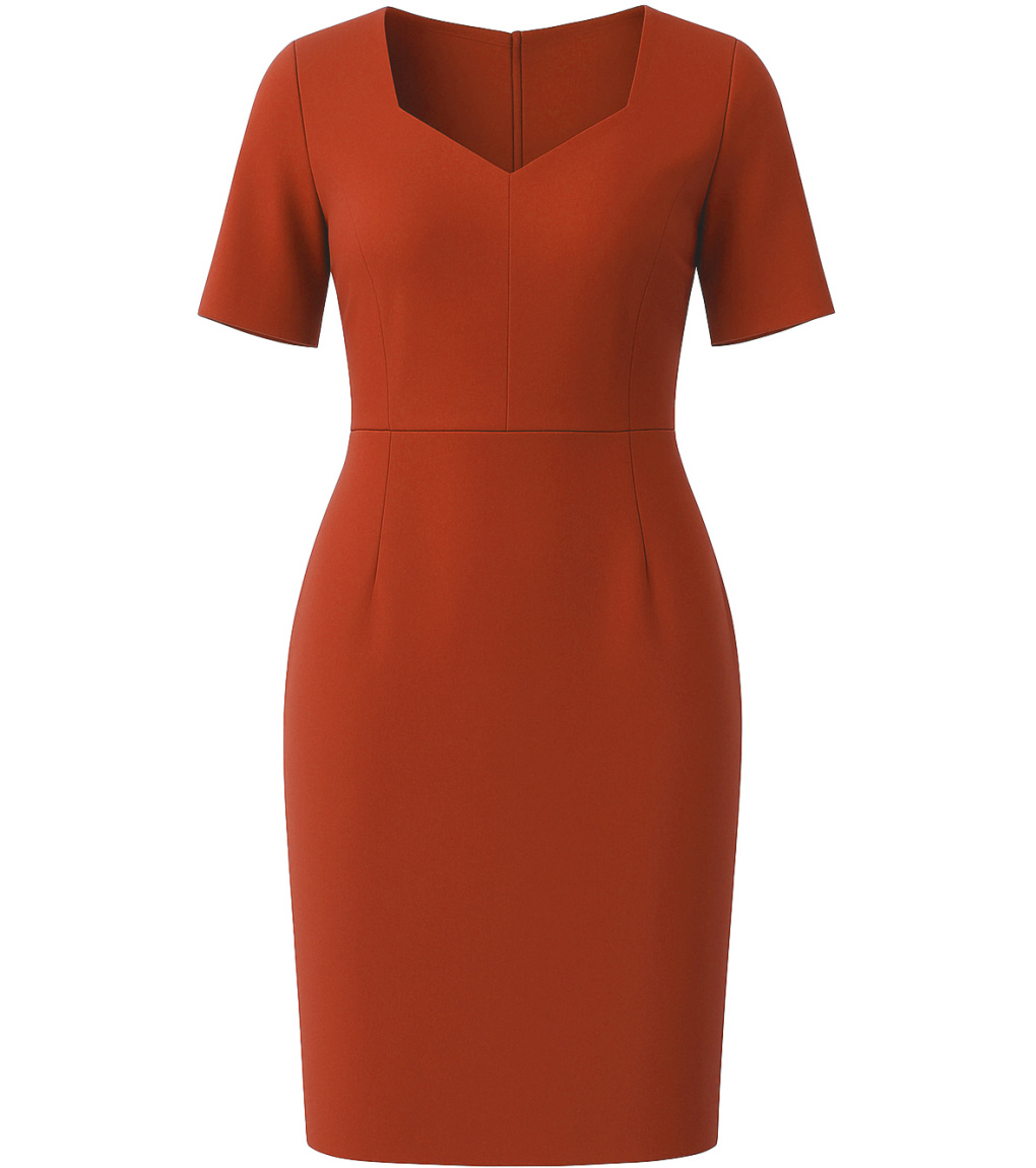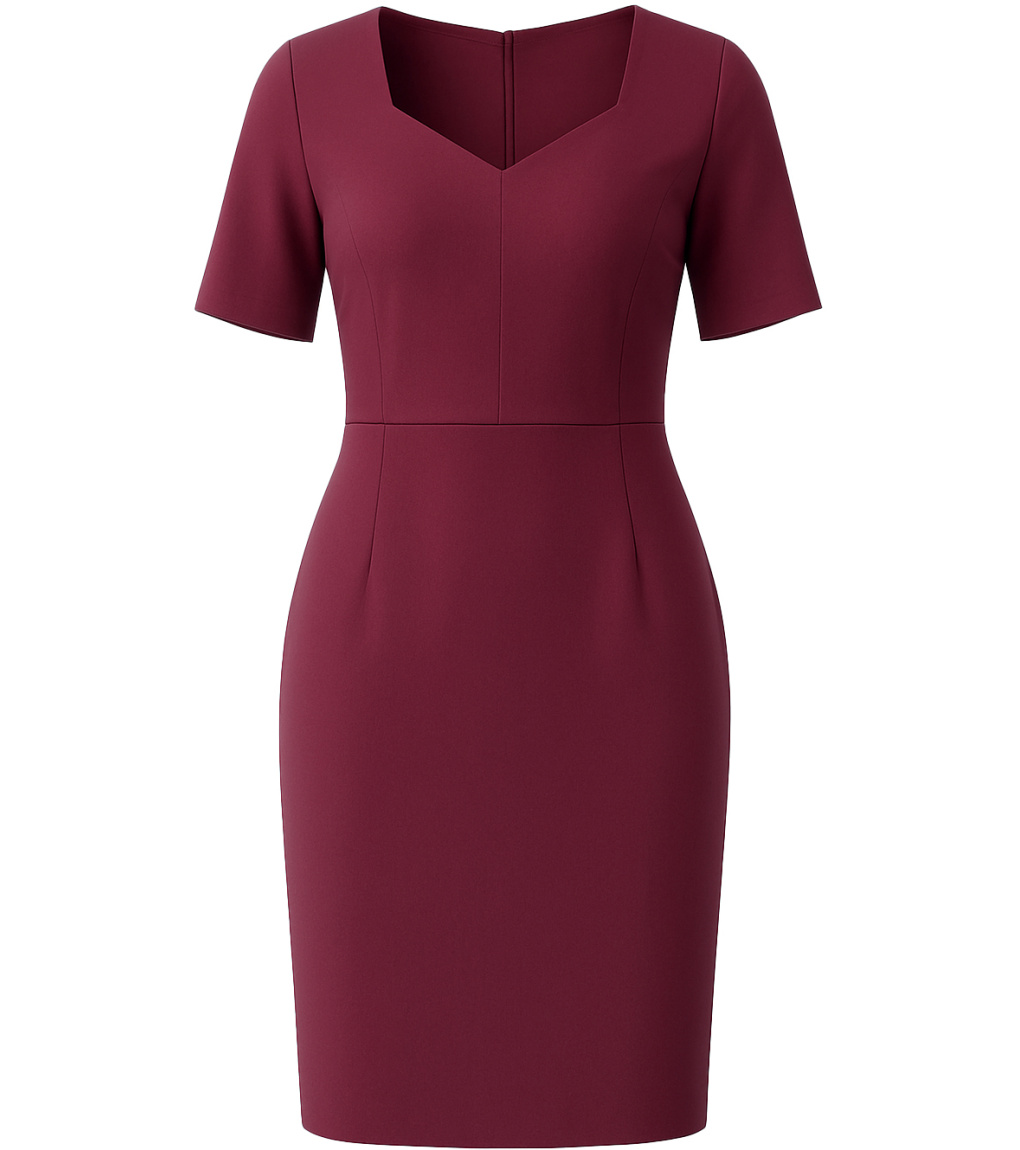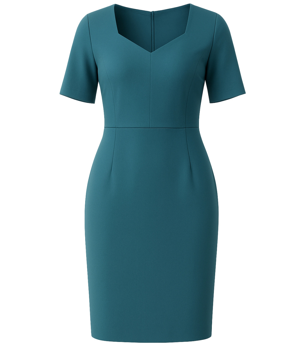 Dámske šaty bez rukávov s krátkymi rukávmi a výstrihom do V. Šaty sú bez podšívky a vzadu majú rozparok. Šaty sa vzadu zapínajú na jemný zips. Dajú sa použiť na spoločenské udalosti aj na bežné nosenie do kancelárie.