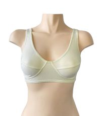 Dámska šitá športová podprsenka so širšími ramienkami cez hlavu. Spodný okraj je obšitý úzkou gumou. Úzka guma je všitá v oblasti prieramkov a výstrihu. Podprsenka je jednofarebná.