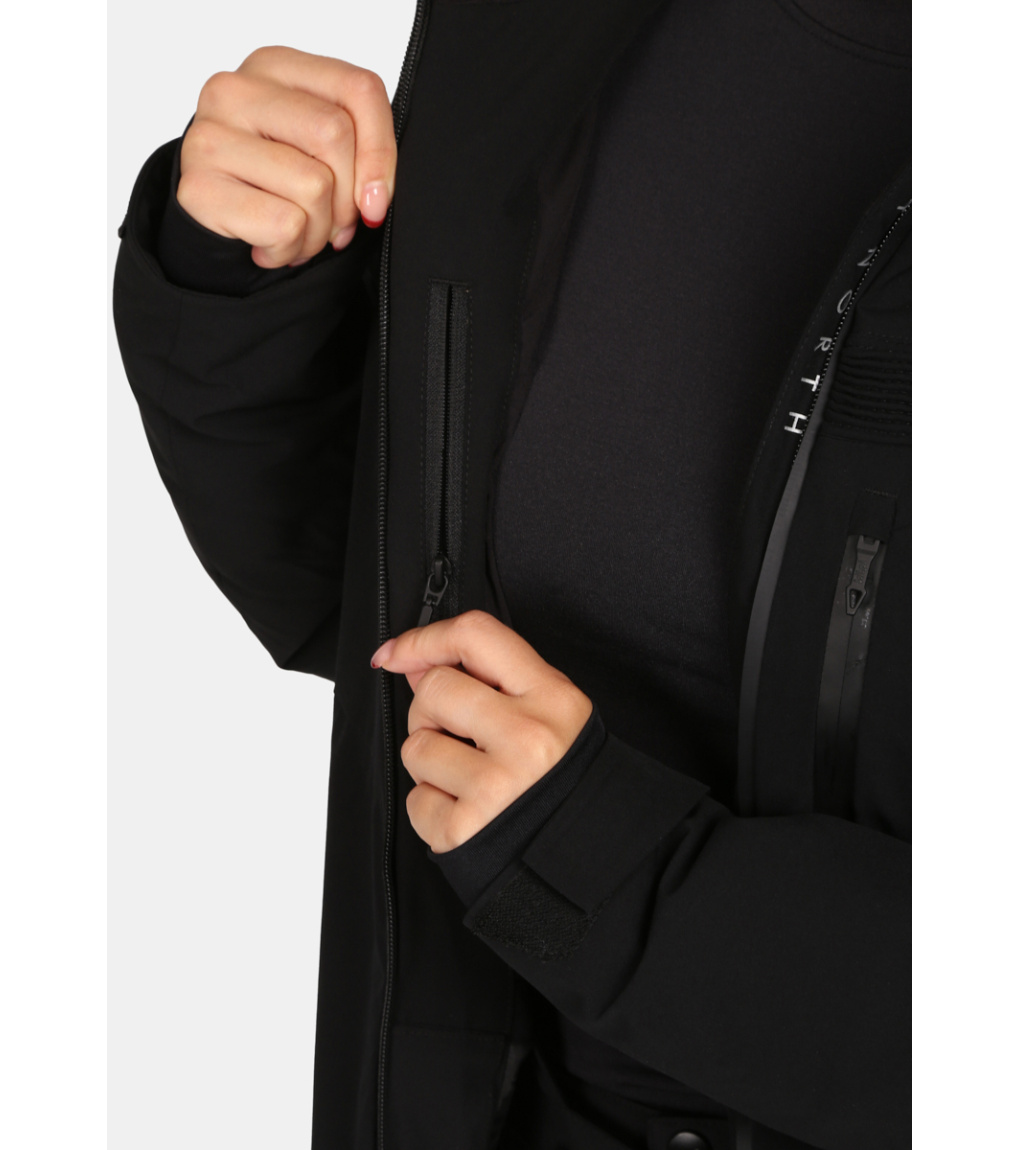 Všitá ochranná snehová manžeta, ktorá zabraňuje prenikaniu snehu pod odev. V spodnej časti je našitá elastická protišmyková guma.