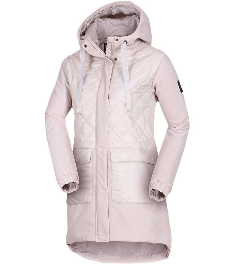 Dámska zimná bunda EMBER je ideálnou voľbou pre mestské prostredie počas mrazivých dní. Kombinácia matných softshellových rukávov a lesklého, široko prešívaného tela vytvára elegantný kontrast, ktorý pôsobí štýlovo a moderne. Funkčné prvky ako syntetická izolácia, predĺžený strih a kapucňa poskytujú výborný tepelný komfort. Rukávy zo softshellu zvyšujú odolnosť voči vetru a vlhkosti, zatiaľ čo prešívaná predná a zadná časť zaisťujú výbornú hrejivosť. Bunda je vybavená dvoma vreckami a kvalitným hlavným zipsom s vnútornou vetrovkou.