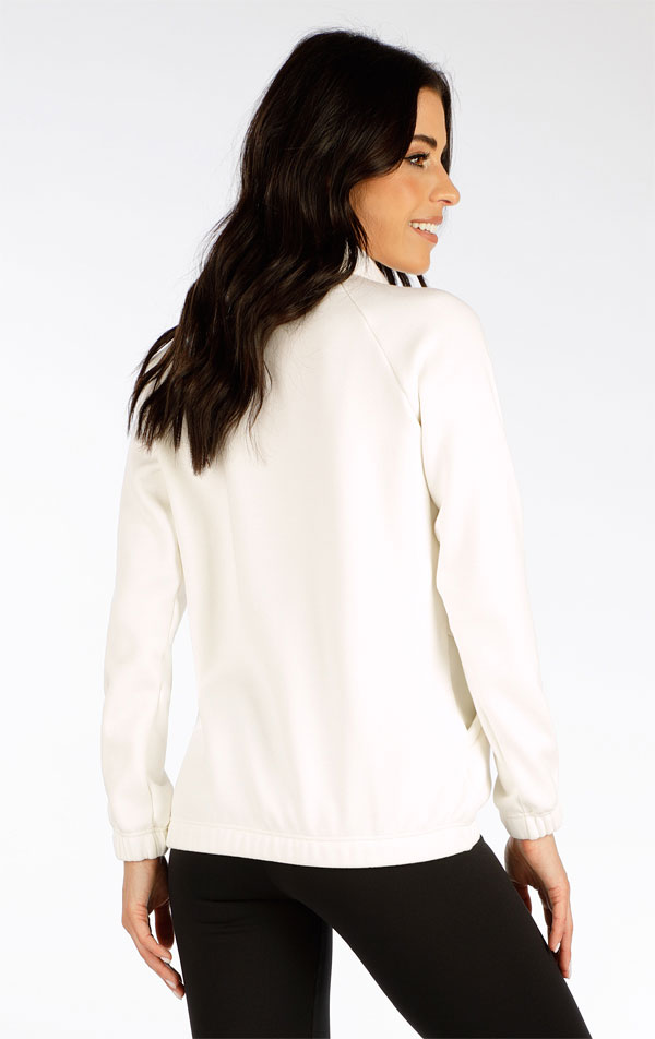 Voľnejší strih s bočnými vreckami. Vyšší stojak s priechodkami a šnúrkou s ozdobnými koncovkami. Dĺžka mikiny a rukávov s nabratím do gumy. Mikinový úplet s vnútorným vyšším počesom je veľmi teplý a príjemný na tele. Vďaka bavlne a elastanu je krásne mäkký a pružný.