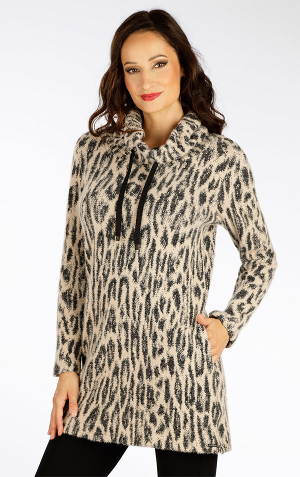 Vysoký stojak s priechodkami a šnúrkou so striebornými koncovkami. Praktické bočné vrecká. Silnejšia pletenina so zvieracím vzorom je pružná a príjemná na tele. Originálna tunika, ktorá Vás zahreje a je praktická na údržbu.