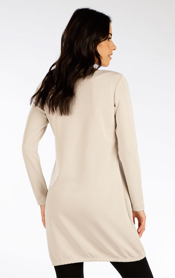 Jednoduchý strih šiat bez vreciek s miernym nabratím do gumy v dĺžke. Okrúhly hladký výstrih a ozdobná aplikácia na prednom diele. Luxusný pružný materiál s príjemným vnútorným počesom. Hladký, hodvábny omak a hrejivé vlastnosti materiálu, vykúzli úplne komfortný pocit pri nosení.