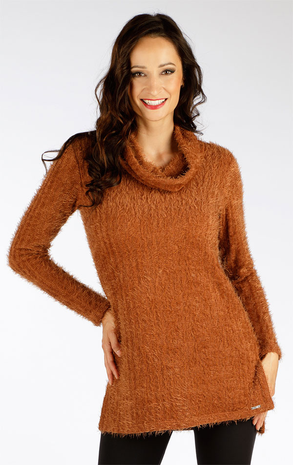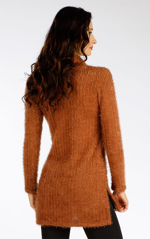 Vysoký spadnutý golier. Dlhší zadný diel. Rozparky na bokoch. Originálny vzhľad pleteniny s plastickým vzorom a hebkým, príjemným omakom.