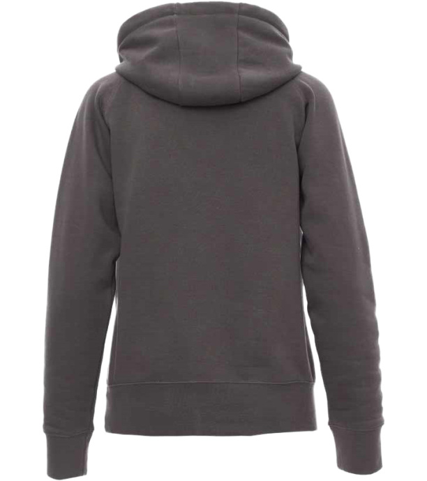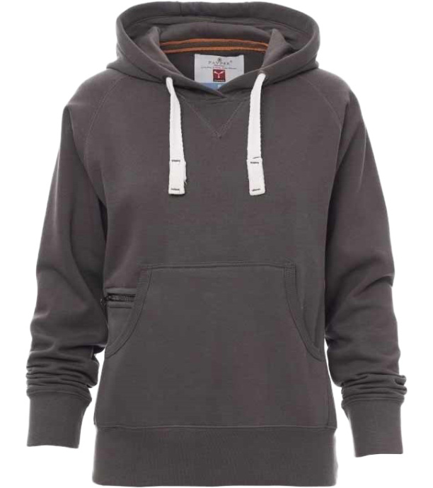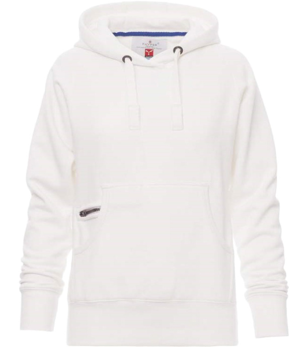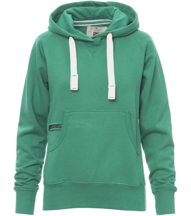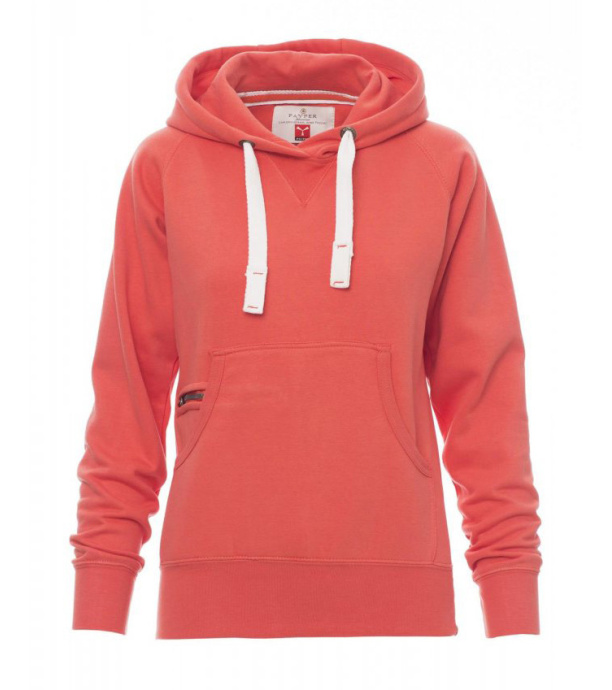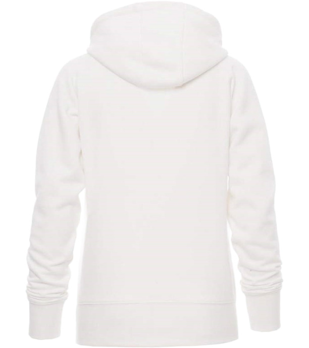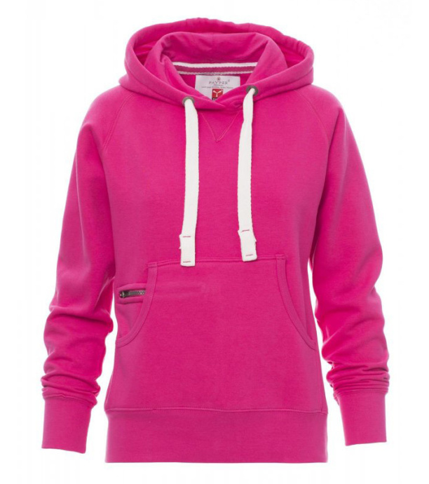 Táto dámska mikina s kapucňou vyniká vyštíhleným strihom, ktorý elegantne zvýrazní siluetu, a je ideálna ako na voľnočasové nosenie, tak na ľahké športové aktivity. Je ušitá s dôrazom na detail a odolnosť – dvojité prešitie a zosilnené švy zaisťujú dlhú životnosť. Kapucňa je doplnená bielou sťahovacou šnúrkou s kovovými očkami a ladiacim prešitím, čo dodáva mikine moderný vzhľad. Raglánové rukávy zaisťujú voľnosť pohybu, zatiaľ čo dekoratívne V-prešitie pod výstrihom dodáva jemný štýlový akcent. Praktické klokanie vrecko je navyše doplnené o diskrétne vrecko na zips, ideálne na drobnosti. Rukávy aj spodný lem sú zakončené elastickým rebrovaním, ktoré napomáha pohodlnému a priliehavému noseniu. Celkovo ide o kvalitný a štýlový kúsok vhodný na každú príležitosť.