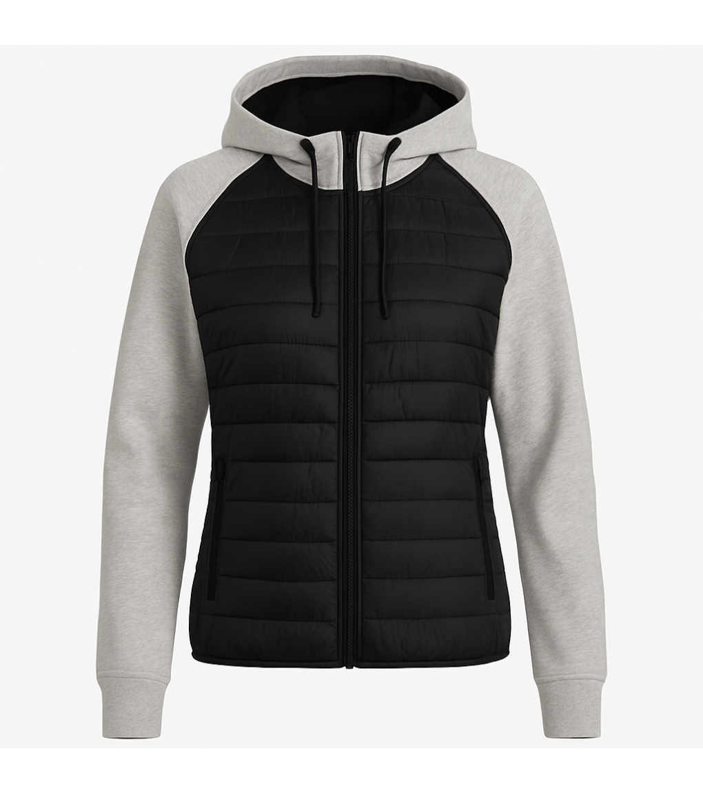 Dámska mikina s kapucňou v modernej kombinácii čiernej a šedej farby. Predná časť je prešívaná pre lepší tepelný komfort a štýlový vzhľad. Mikina má dve vrecká na zips, vnútornú fleecovú podšívku s počesom a sťahovaciu kapucňu. Ideálna ako ľahká bunda na prechodné obdobie alebo pohodlná vrstva na chladnejšie dni.