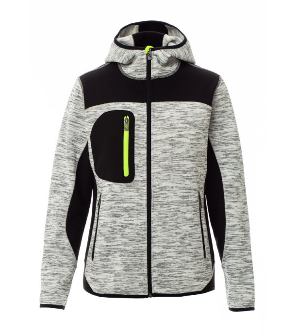 Technická mikina kombinovaná so softshellovými vsadkami v kontrastnej čiernej farbe. Dvojfarebné prevedenie s utesneným celoprepínacím zipsom SBS. Má tvarovanú kapucňu s dvojitým prešitím, tenký elastický lem na rukávoch a spodnom okraji. Praktické usporiadanie vreciek zahŕňa dve bočné vrecká na zips a jedno vrecko na hrudi.