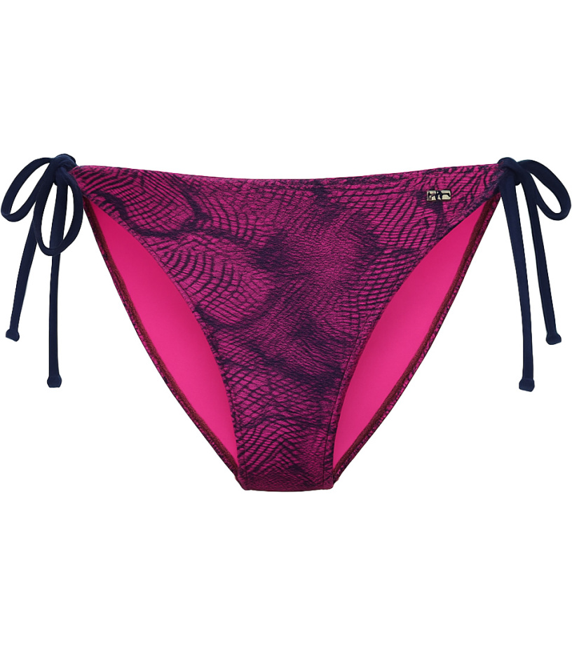 Dámske plavkové nohavičky 4F v modernom ružovo-fialovom dizajne s jemným vzorom a kontrastnými tmavomodrými šnúrkami na bokoch umožňujú nastavenie obvodu pre perfektné prispôsobenie postave. Sú vyrobené z rýchloschnúceho, elastického materiálu, ktorý zaisťuje pohodlie a voľnosť pohybu pri plávaní i opaľovaní. Štýlový kúsok na letné dni pri vode.