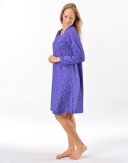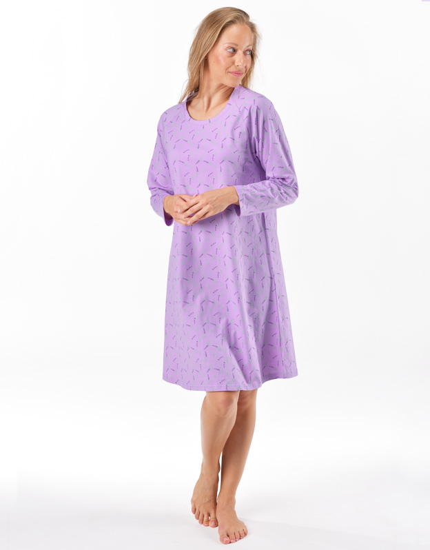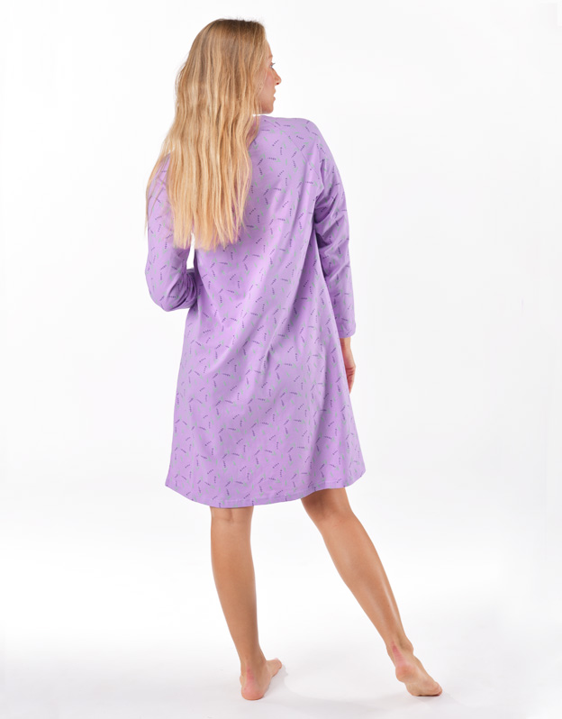 Základom kvalitného spánku je vaše pohodlie, ku ktorému vám pomôže aj pohodlná nočná bielizeň. Nočná košieľka má potlač s motívom levandule, dĺžku po kolená, dlhý rukáv a okrúhly výstrih. Každú milovníčku prírodných materiálov poteší materiál zo 100% bavlny, ktorý vám zaistí pohodlie po celú noc.