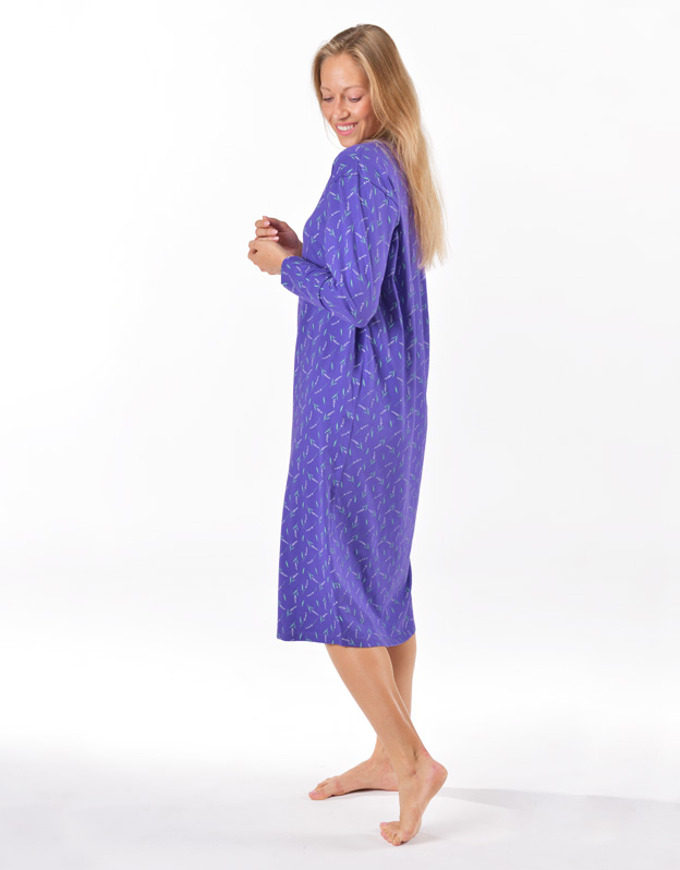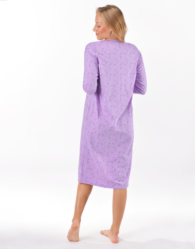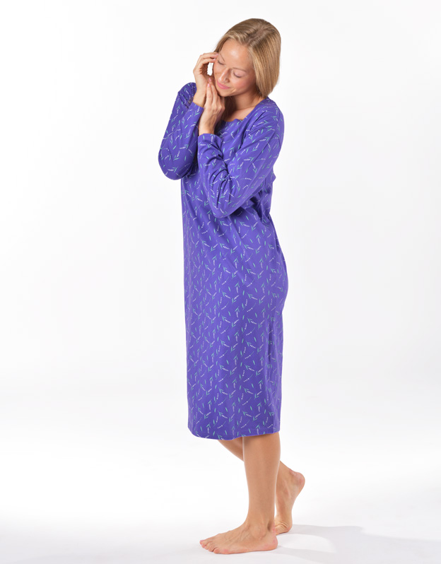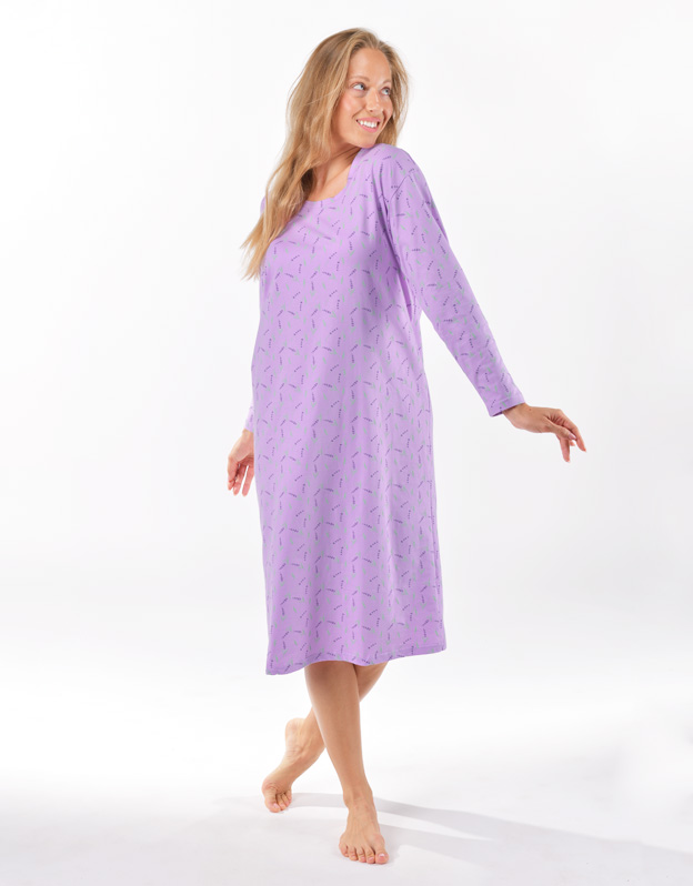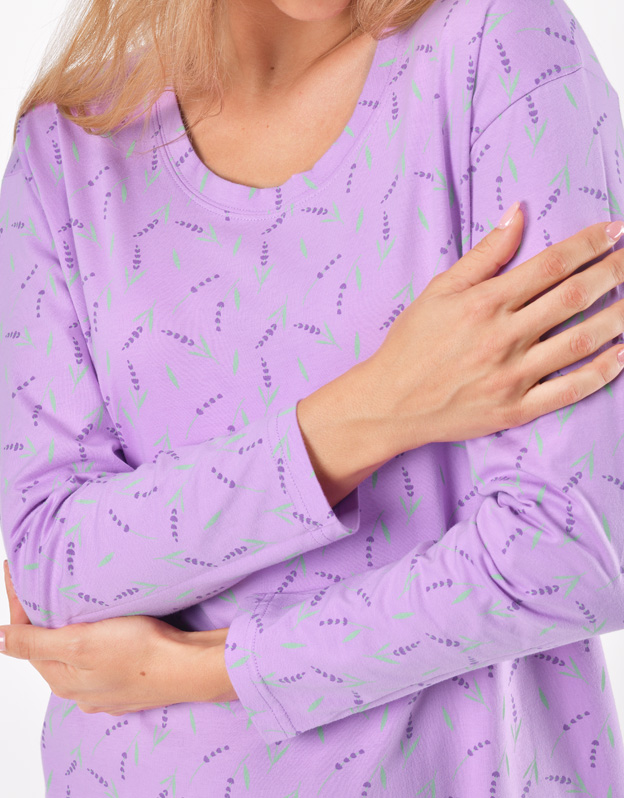 Základom kvalitného spánku je vaše pohodlie, ku ktorému vám pomôže aj pohodlná nočná bielizeň. Naša dámska nočná košieľka s dlhým rukávom je ideálnou voľbou pre každú milovníčku voľných strihov a kvalitných materiálov. Nočná košieľka je dlhá, zdobí ju potlač s levanduľami, nikde neškrtí. Materiál zo 100% bavlny vám zaistí pohodlie po celú noc.