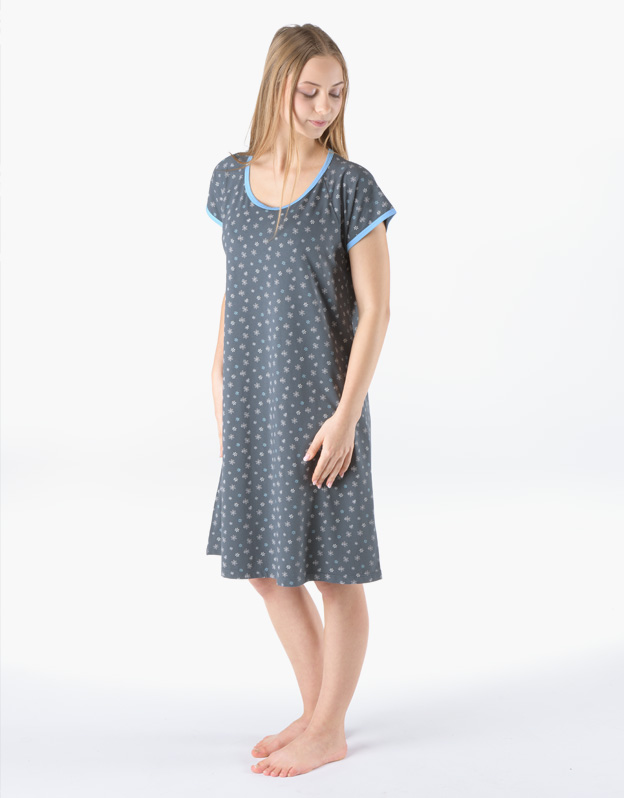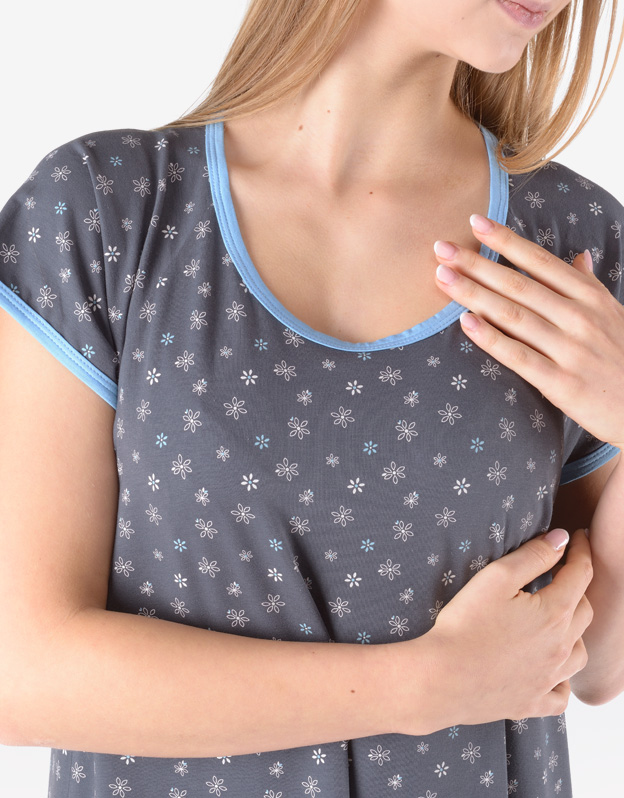 Nočná košieľka s krátkym rukávom Vám poskytne jedinečné pohodlie počas spánku. Okrúhly výstrih a rukávy sú olemované svetlo modrým prúžkom, košieľka je potlačená jemným kvetinovým vzorom. Nechajte sa objať touto luxusnou kolekciou ECO Bamboo nočnej bielizne.