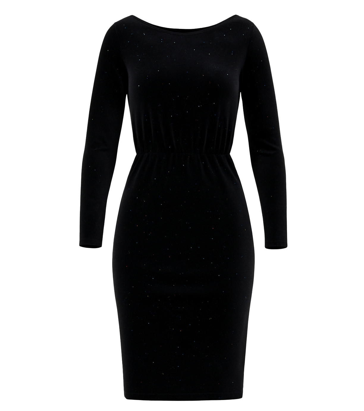 Dámske šaty s okrúhlym výstrihom a výstrihom na chrbte. Elastický pás. Švy v prednej časti. Šaty majú dlhé rukávy a sú zdobené farebnými flitrami.