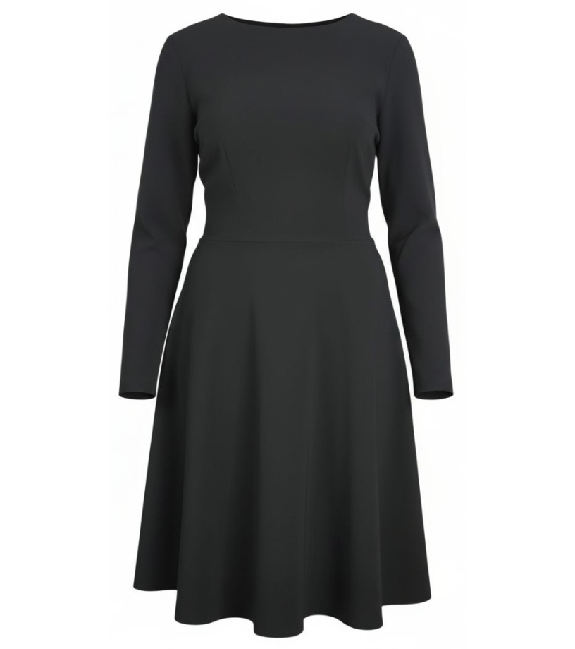 Dámske šaty s dlhým rukávom. Zapínanie na chrbte. Šaty sú v páse prestrihnuté, sukňa sa postupne rozširuje. Švy na chrbte a v oblasti hrudníka.
