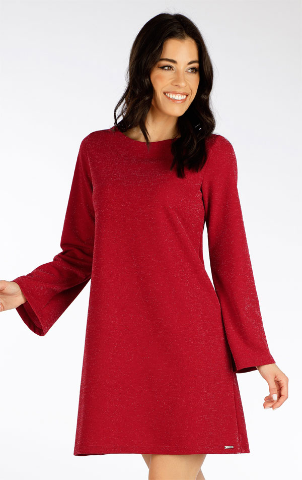 Lodičkový výstrih. Voľný strih bez vreciek s dlhým rukávom do zvonu. Elegantný úplet so strieborným vláknom je pružný a tvarovo stály. Šaty sú vhodné nielen na bežné nosenie, ale aj na slávnostné príležitosti.