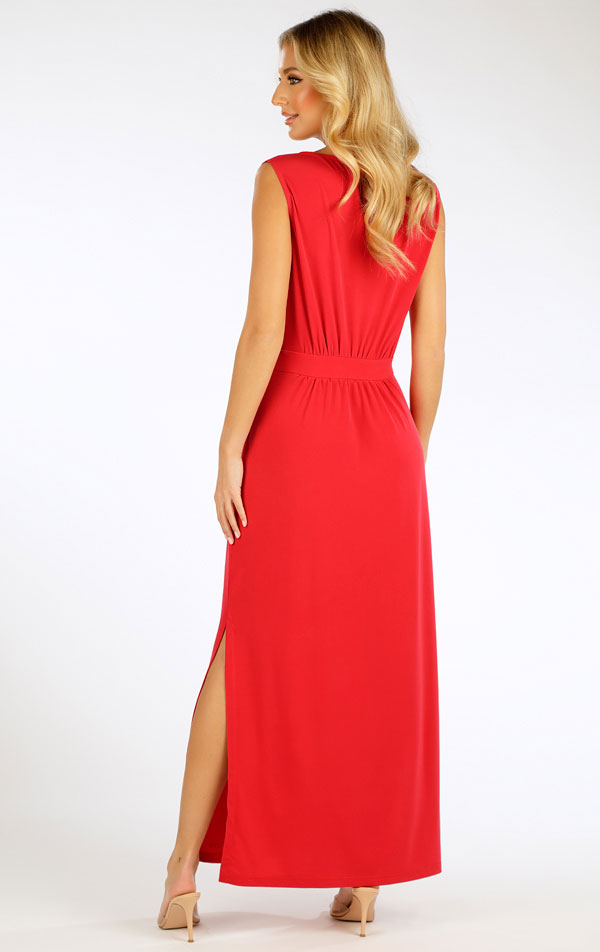 Dlhé dámske šaty bez rukávov s lodičkovým výstrihom a voľnejším strihom pre pohodlné nosenie. V páse je opasok s riasením, ktorý zvýrazní siluetu. Bočné rázporky po oboch stranách podporujú voľnosť pohybu a opticky predlžujú postavu. Štýlový kúsok vhodný na letné dni aj voľnočasové príležitosti. Ľahká a pružná zmes polyesteru a elastanu ponúka komfort, jednoduchú údržbu a nízku krčivosť. Dĺžka: cca 140 cm.