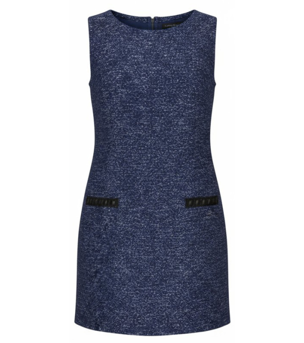 Dámske šaty rovnejšieho strihu, bez rukávov. Šaty majú falošné vrecká podšité pásom čiernej čipkovej látky. Zapínanie na krátky zips pri krku. Šaty sú vhodné na spoločenské udalosti aj do kancelárie.