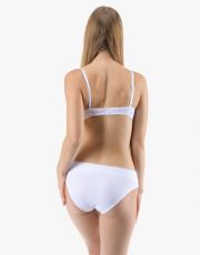 Bokové nohavičky so širším bokom a so širším pásovým lemom, dámske šité prádlo. Pásový kraj je začistený širším lemom z rovnakého materiálu. Nohavičky sú začistené úzkym lemom z rovnakého materiálu. Predný diel je potlačený. Zadný diel a lemy sú jednofarebné.