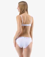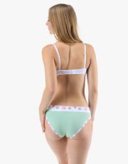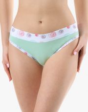 Bokové nohavičky so širším bokom a so širším pásovým lemom, dámske šité prádlo. Pásový kraj je začistený širším lemom z rovnakého materiálu. Nohavičky sú začistené úzkym lemom z rovnakého materiálu. Lemy v páse av nohavičkách sú potlačené. Predný a zadný diel je jednofarebný.