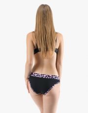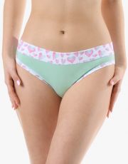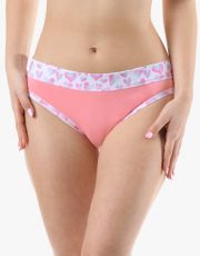 Bokové nohavičky so širším bokom a so širším pásovým lemom, dámske šité prádlo. Pásový kraj je začistený širším lemom z rovnakého materiálu. Nohavičky sú začistené úzkym lemom z rovnakého materiálu. Lemy v páse av nohavičkách sú potlačené. Predný a zadný diel je jednofarebný.