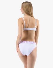 Nohavičky klasického strihu s úzkym bokom a širším pásovým lemom, dámske šité prádlo. Pásový kraj je začistený širším lemom z rovnakého materiálu. Nohavičky sú začistené úzkym lemom z rovnakého materiálu. Predný diel je jednofarebný, lemy v páse av nohavičkách sú potlačené.