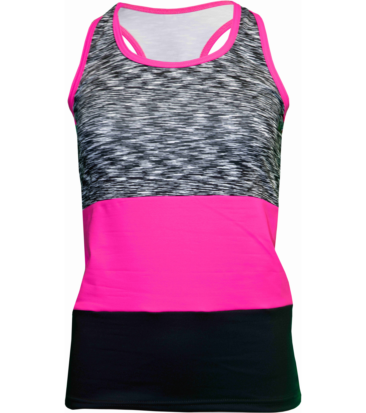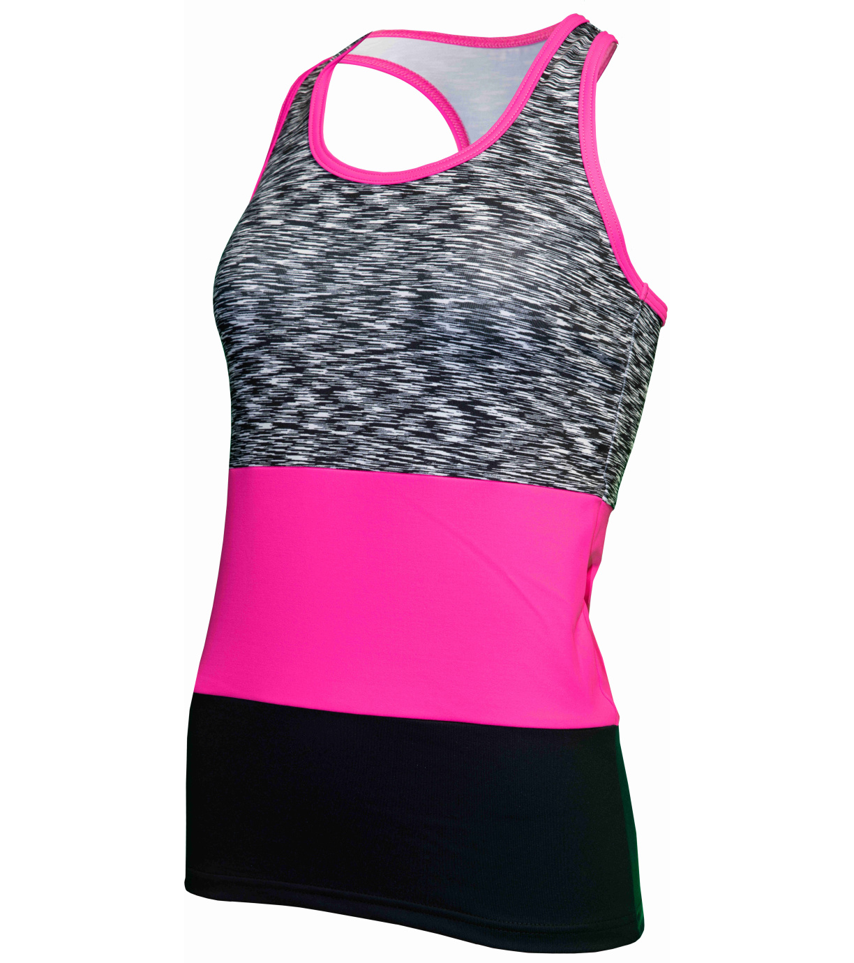 Dámské trojbarevné tílko je vyrobeno z polyamidu. Zářivé barvy, sportovní střih a kvalitní látka dělají z tohoto tílka společníka pro každou sportovní příležitost. Vyříznutí na zádech v boxerském stylu. Dvojité prošití výstřihu, průramku a dolního okraje. Vzhledem k hladkému povrchu vláken se dobře a snadno čistí. Polyamid rychle schne, nemačká se a nežmolkovatí. Je proto perfektní součástí funkčního a sportovního oblečení. Vyrobeno v České Republice.